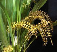 DESCRIPTION: Small to medium sized, hot to cool growing epiphyte with oblong, dark green pseudobulbs with large, acute gradually narrowing below into the petiolate base leaf that blooms in the spring and summer on a undeveloped pseudobulb before the leaf emerges, 10 to 13 [25 to 32.5 cm] long, many [25 to 35 flowered inflorescence.