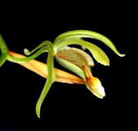 DESCRIPTION: Miniature sized, cool to cold growing epiphyte with close set, gray green, rough textured, fat, ovoid pseudobulbs carrying 2, apical, thin, green sometimes suffused with purple, elliptic, slightly plicate, 3 nerved, obtuse to pointed, gradually narrowing below into the petiolate base leaves that blooms in the spring through summer on a terminal, erect, 18 to 36 [45 to 90 cm] long, rachis flattened, fractiflex and covered with fertile, green, deciduous, distichous, imbricating, longitudinally folded bracts, 6 to 12 flowered, racemose inflorescence arising on a newly emerging growth with a single successive not wide opening, drooping flower.