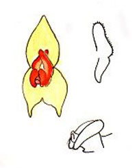 DESCRIPTION: Mini-miniature sized, cold growing epiphyte with slender, erect ramicauls enveloped by 5, microscopically ciliate, lepanthiform sheaths and carrying a single, apical, erect, coriaceous, ovate, obtuse, cuneate below into the petiolate base leaf that blooms in the winter on a filiform, loose, flexuous, to 2.4 [to 6 cm] long including the .4 [1 cm] long peduncle, successively single, many flowered inflorescence holding the flower well beyond the leaf.