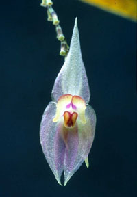 DESCRIPTION: Small to medium sized, cool to cold growing epiphyte with an erect, slender to stout ramicaul enveloped by 9 to 14, minutely ciliate, lepanthiform sheaths and carrying a single, apical, erect, thinly coriaceous, oblong-ovate, acute, acuminate, cuneate to rounded below into the contracted, petiolate base leaf that blooms late winter through summer on a filiform, congested, distichous, 3.2 inches [8 cm] long, racemose, successively many flowered inflorescence arising from behind the leaf.