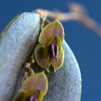 DESCRIPTION: Miniature sized, cool growing epiphyte with erect, slender ramicauls enveloped by 13 to 14, leapnthiform sheaths with dilate, ciliate ostia and carrying a single, purple suffused, glabrous to minutely pubescent, concave sulcate, spreading, coriaceous, ovate, acute, rounded and contracted below into the petiolate base leaf that blooms in the summer on a slender, within the sulcus of the top of the leaf, congested, secund, .8 to 1” [2 to 2.5 cm] long including the .4 to .6” [1 to 1.5 cm] long peduncle, successively single, many flowered inflorescence.