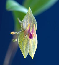 DESCRIPTION: Miniature sized, cold growing epiphyte with erect ramicauls enveloped completely by 3 to 4, tubular, dilated, pilose lepanthiform sheaths and carrying a single, apical, erect, oblong-elliptic to subovate-elliptic, obtuse and minutely tridenticulate apically, cuneate below into the petiolate base leaf that blooms in the spring on 1 to 3, erect, filiform, lax, distichous, .72 to .92 [1.8 to 2.3 cm] long including the .4 to .6” [1 to 1.5 cm] long peduncle, , successively several flowered, fractiflex inflorescence.
