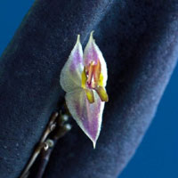 DESCRIPTION: Miniature sized, cold growing epiphyte with slender, erect, ramicauls enveloped by 8 to 12, coarsely ciliate lepanthiform sheaths with dilate ostia and carrying a single, apical, erect, coriaceous, dark purple, immature leaves ovate, acute, flat, the mature leaves spreading, narrowly ovate, acute, acuminate, revolute and undulate margined, mid rib prominent beneath, the rounded, convex and contracted below into the petiolate base leaf that blooms late spring through early fall on a filiform, subdense, [1.6 to 1.8 cm] long including ther [8 to 10 mm] long peduncle, successively single, few flowered inflorescence arising on top of the leaf.