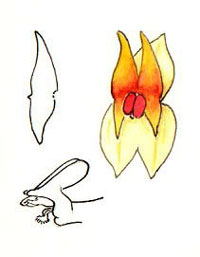 DESCRIPTION: Mini-miniature sized, cool to cold growing epiphyte with slender, erect ramicauls enveloped completely by 10 to 11, close, glabrous to microscopically scabrous, lepanthiform sheaths and carrying a single, apical, spreading to deflexed, thinly coriaceous, elliptic-ovate, obtuse, contracted into a linear apical segment, rounded and abruptly contracted below into the short petiolate base leaf that blooms in the later spring and fall on a, filiform, very congested, distichous, .64 to .8 [1.6 to 2 cm] long including the .12 to .28 ” [3 to 7 mm] long peduncle, successively single, few flowered inflorescence arising on top of the leaf.