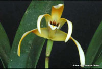 DESCRIPTION: Small sized, hot to warm growing epiphyte with ovoid to conic, slightly compressed pseueobulbs enveloped partially below by several smooth, chartaceous, minutely spotted, triangular, acute sheaths and carrying a single apical oblong-elliptic, acute, gradually narrowing below into the elongate, conduplicate, petiollate base leaf that blooms in the fall through spring on an erect, 1.6 to 6 [4 to 15 cm] long, single flowered inflorescence concealed by 4 to 6, inflated, minutely spotted bracts.