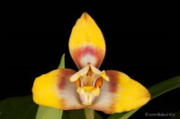 DESCRIPTION: Medium sized, cool to cold growing epiphyte or terrestrial on steep embankments with ovate, compressed pseudobulbs enveloped basally by 1 to 2 large foliaceous sheaths carrying a single, apical, oblong-lanceolate, stiff, coriaceous, acute leaf with a conduplicate base into an elongate, compressed, channeled petiole and a prominently carinate mid-vein that blooms in the fall in situ on an erect, basal, 7 1/5 [18 cm] long, single-flowered inflorescence arising on a newly matured pseudobulb and enveloped completely by 11 to 14, tubular, acuminate sheaths ans carrying heavy textured, fragrant flowers.