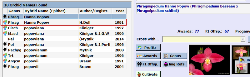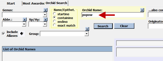 Remember to only enter that of which you are certain. Suppose you had a broken tag for a phrag and can only see the last part of the name. Or suppose you are looking for Phrag. Hanne Popow but do not know how to spell "Hanne". In both these cases, we are only sure of the last name of the plant: "POPOW". So, let's look for that. In this case, the name "POPOW" is so rare that you can simply enter it and find your orchid, without any other search criteria: