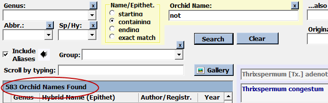 Well, that's great... but what if the last letters of a broken tag was a string of text much more common, such as "Not"? In this case, if we search for a name containing "not", we get way too many orchids, a total of 583!!!