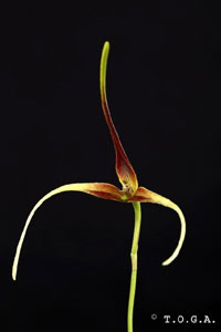 DESCRIPTION: Miniature sized, hot growing epiphyte with 1 to 2 between each, cylindrical, straight then curved, elongate pseudobulbs carrying a single apical, oblong, petiolate and channeled below leaf that blooms in the spring and fall on a basal, lateral, slender, 5 1/2 [14 cm] long, single flowered inflorescence that holds the wide open flowers above the leaves.