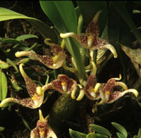 DESCRIPTION: Creeping medium sized, hot to warm growing epiphyte with close set, obliquely erect, ovoid pseudobulbs carrying a single,, apical, erect, obovate, acuminate, gradually narrowing below into the .8 to 1 [2 to 2.5 cm] long, petiolate base leaf that blooms in the later spring on a basal, erect to patent, to 1.6 [4 cm] long, single flowered inflorescence with a tubular, apiculate floral bract.