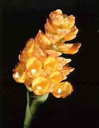 DESCRIPTION: Medium to just large sized sized, warm to cool growing terrestrial with stiffly erect stems that are leafless below and leafy above, carrying loosely several, subcoriaceous, strigose-punctate beneath, plicate, lanceolate, acute, long acuminate, abruptly narrowing below into the basally clasping leaves that blooms at most any time of the year on a terminal, sessile, elongate rachis, arcuate-recurved, slightly longer than the terminal leaf, spirally arranged, elongate, 3.2 [8 cm] long, densely many flowered inflorescence carrying orange flowers with cymbiform, ovate, obtuse bracts.