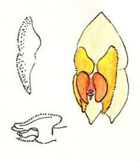 DESCRIPTION: Mini-miniature sized, cool to cold growing epiphyte with very slender, weak, suberect ramicauls enveloped by 7 to 9, thin, tight fitting, lepanthiform sheaths with minimmally dilated ostia with microscopically scabrous margins and carrying a single, apical, more or less spreading, thinly coriaceous, ovate, acute, long-acuminate, prominently tridenticulate, cuneate below into the petiolate base leaf that blooms in the late summer and earlier fall on a filiform, congested, distichous, .44 [1.1 cm] long, including the .2 [5 mm] long peduncle, successively single, many flowered inflorescence arising on top of the leaf and has lightly muriculate floral bracts.