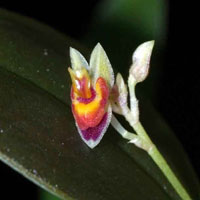 DESCRIPTION: Mini-miniature sized, warm to cool growing epiphyte with erect, slender ramicauls enveloped by 6 to 13 close, minutely ciliate lepanthiform sheaths and carrying a single, apical, coriaceous, reticulated with purple beneath, ovate, acute to shortly acuminate, the rounded base abruptly contracted into the petiolate base leaf that blooms in the winter and spring on a congested, distichous, 3/4 [2.2 cm] long, successively single, several flowered inflorescence arising on the back of the leaf.