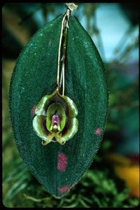 DESCRIPTION: Mini-miniature sized, warm to cool growing epiphyte with slender, erect ramicauls enveloped completely by 8 to 12, ciliate, lepanthiform sheaths with widely dilated ostia and carrying a single, apical, erect, coriaceous, pubescent-ciliate, reticulate rugose, elevated veins red on green, ovate-cordate, obtuse, broadly cordate basally and abruptly contracted into the petiolate base leaf that blooms in the late winter and early summer on a congested, distichous, 1/2 [1.2 cm] long, successively flowered, racemose inflorescence.