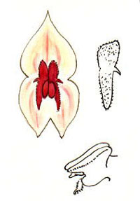 DESCRIPTION: Mini-miniature sized, cold growing epiphyte with erect to horizontal, slender ramicauls enveloped by 7 to 9, close, minutely cilate, lepanthiform sheaths and carrying a single, apical, coriaceous, erect to horizontal in relation to the ramicaul, purplish beneath, ovate, acute, lightly acuminate, cuneate below into the petiolate base leaf that blooms in the later spring on a filiform, congested, .52 to .68 [1.3 to 1.7 cm] long including the .32 to .48 [8 to 12 mm] long peduncle, successively single, few flowered inflorescence arising on the top of the leaf.