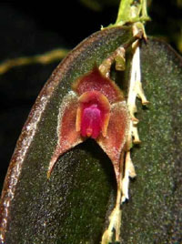 DESCRIPTION: Mini-miniature sized, cool to cold growing epiphyte with slender, erect ramicauls enveloped by 5 to 7, thin, pale, ciliate lepanthiform sheaths with dilated ostia and carrying a single, apical, erect, coriaceous, purple suffused below, ovate, subacute, rounded below and contracted into the petiolate base leaf that blooms in the spring and fall on a dense, secund, .8 to 1.4 [2 to 3.5 cm] long including the .2 to .6 [5 to 15 mm] long peduncle, successively single, few flowered inflorescence arising on back of the leaf.
