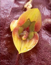 DESCRIPTION: Small to medium sized, warm to cool growing epiphyte with stout, erect, ramicauls enveloped basally by 13 to 30, long-acuminate, glabrous, lepanthiform sheaths and carrying a single, apical, thinly coriaceous, bent from the axis of the ramicaul, subplicate, purplish, elliptical, subacute, long-acuminate leaf that is cuneate below into a petiole that blooms in the spring on an erect, congested, distichous, 1 [2.5 cm] long, successively many flowered, racemose inflorescence. One of the larger species in this genus.