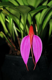 Masdevallia Bewitched is an orchid hybrid originated by J.Leathers in 2008. It is a cross of Masd. coccinea x Masd. rosea. It is considered a "primary hybrid" because it is a cross between two species.